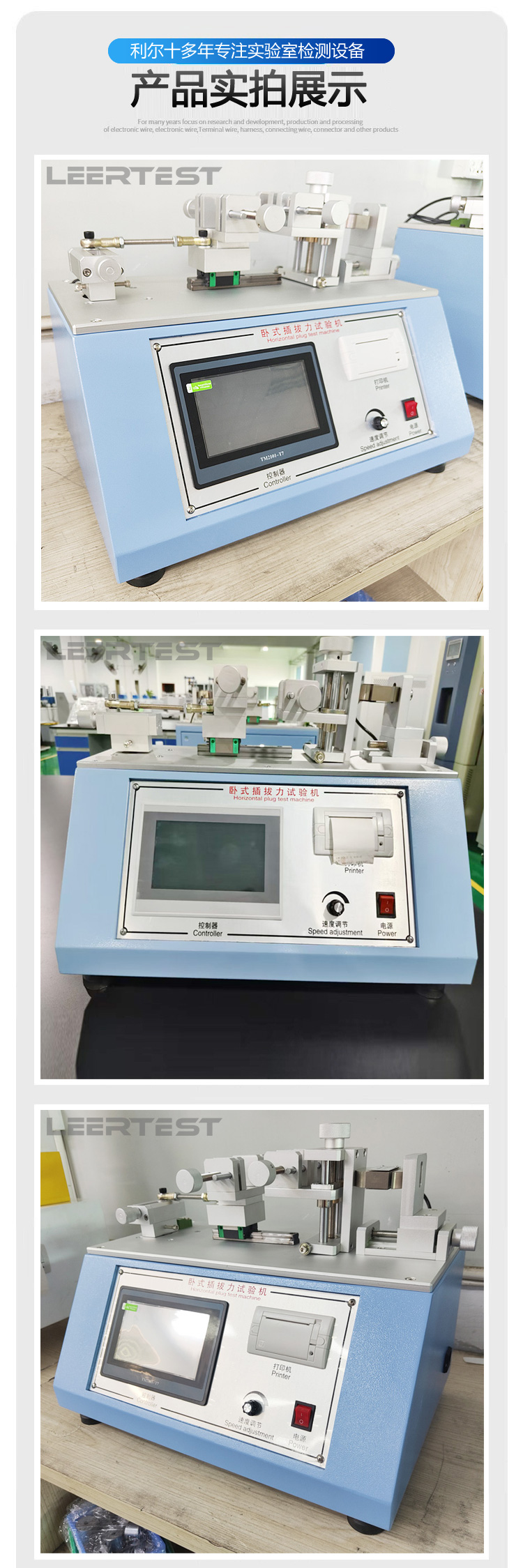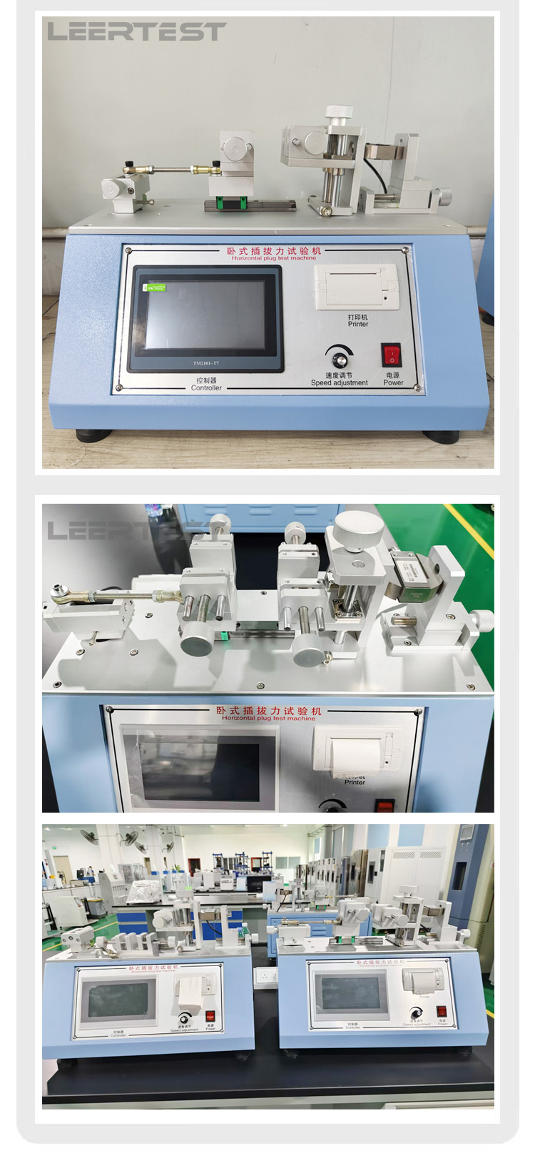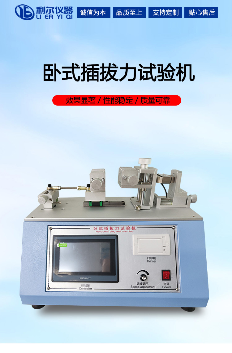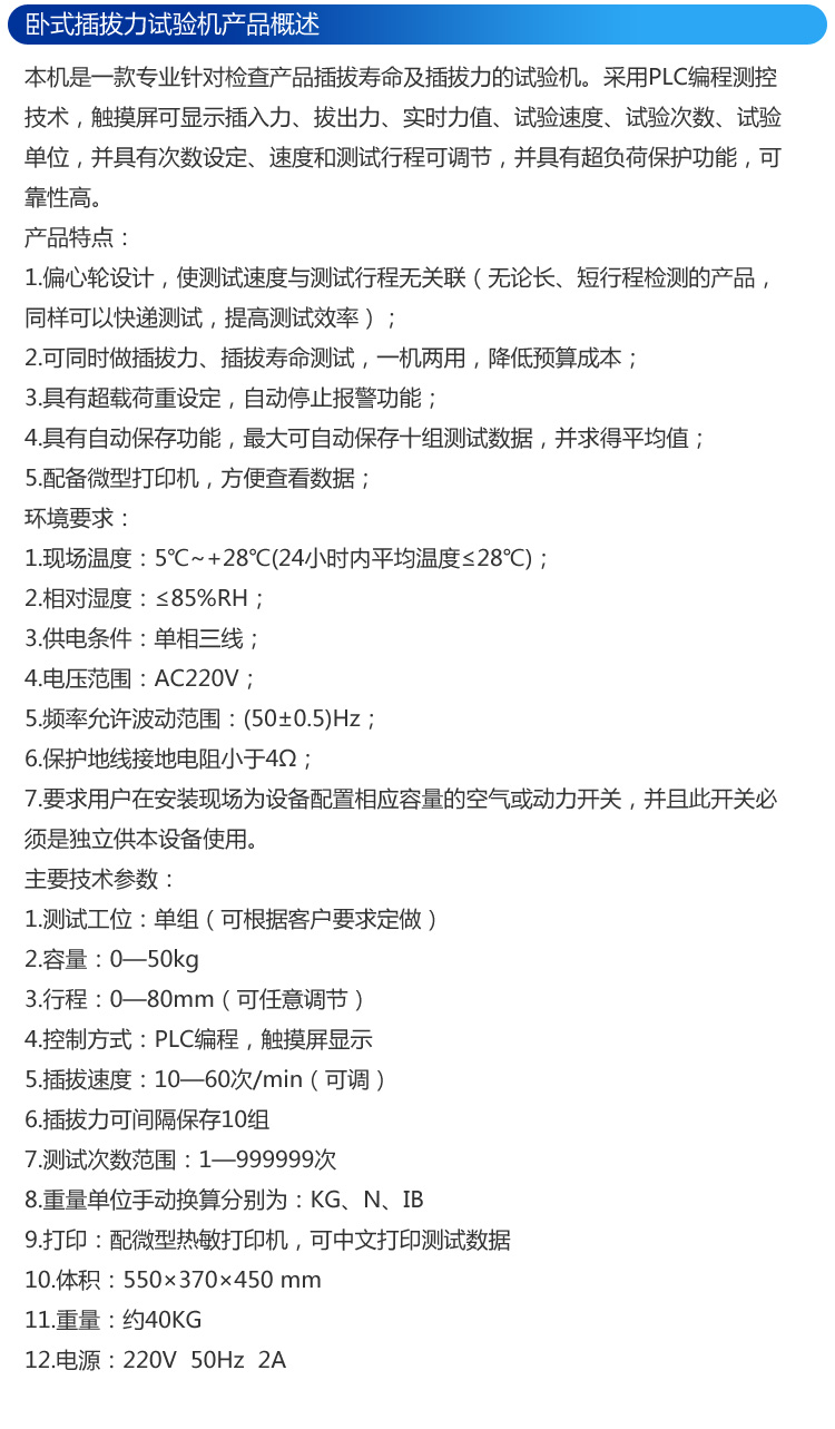 本机是一款专业针对检查产品插拔寿命及插拔力的试验机。采用PLC编程测控技术,触摸屏可显示插入力、拔出力、实时力值、试验速度、试验次数、试验单位,并具有次数设定、速度和测试行程可调节,并具有超负荷保护功能,可靠性高。