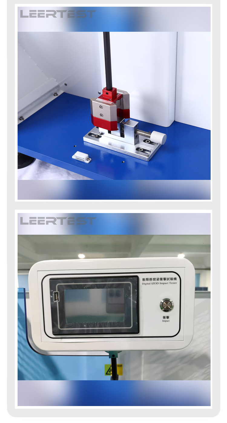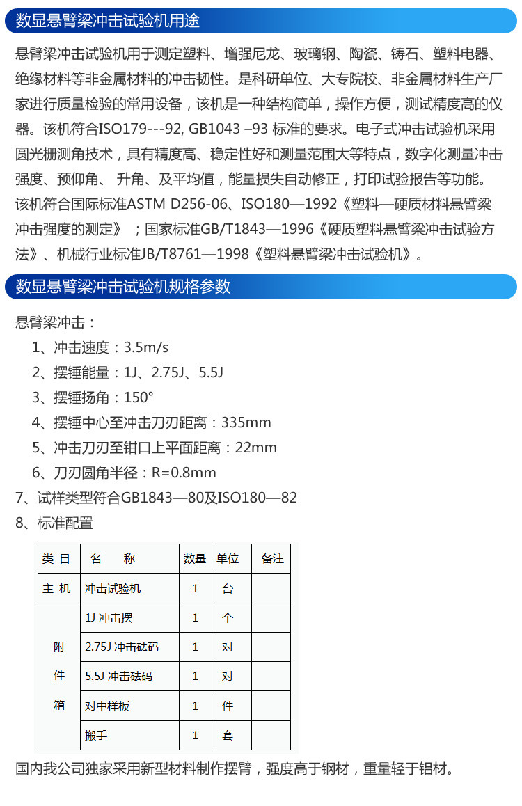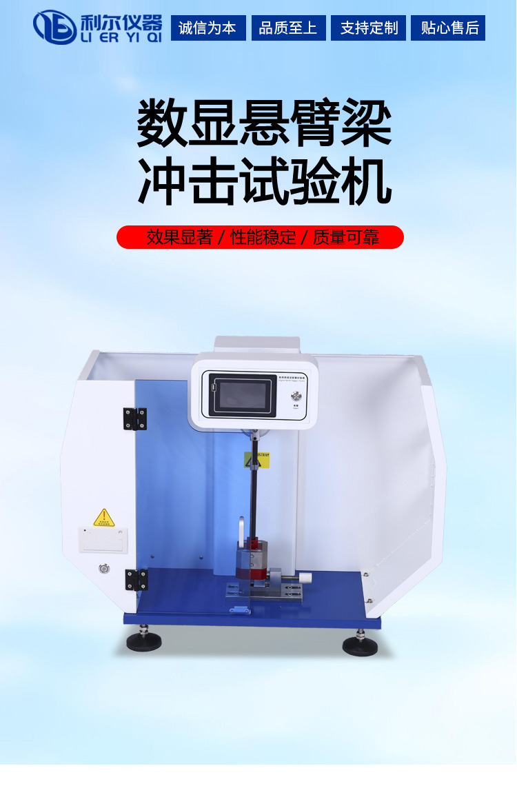 悬臂梁冲击试验机用于测定塑料、增强尼龙、玻璃钢、陶瓷、铸石、塑料电器、绝缘材料等非金属材料的冲击韧性。是科研单位、大专院校、非金属材料生产厂家进行质量检验的常用设备,该机是一种结构简单,操作方便,测试精度高的仪器。该机符合ISO179—92, GB1043 –93 标准的要求。电子式冲击试验机采用圆光栅测角技术,具有精度高、稳定性好和测量范围大等特点,数字化测量冲击强度、预仰角、 升角、及平均值,能量损失自动修正,打印试验报告等功能。