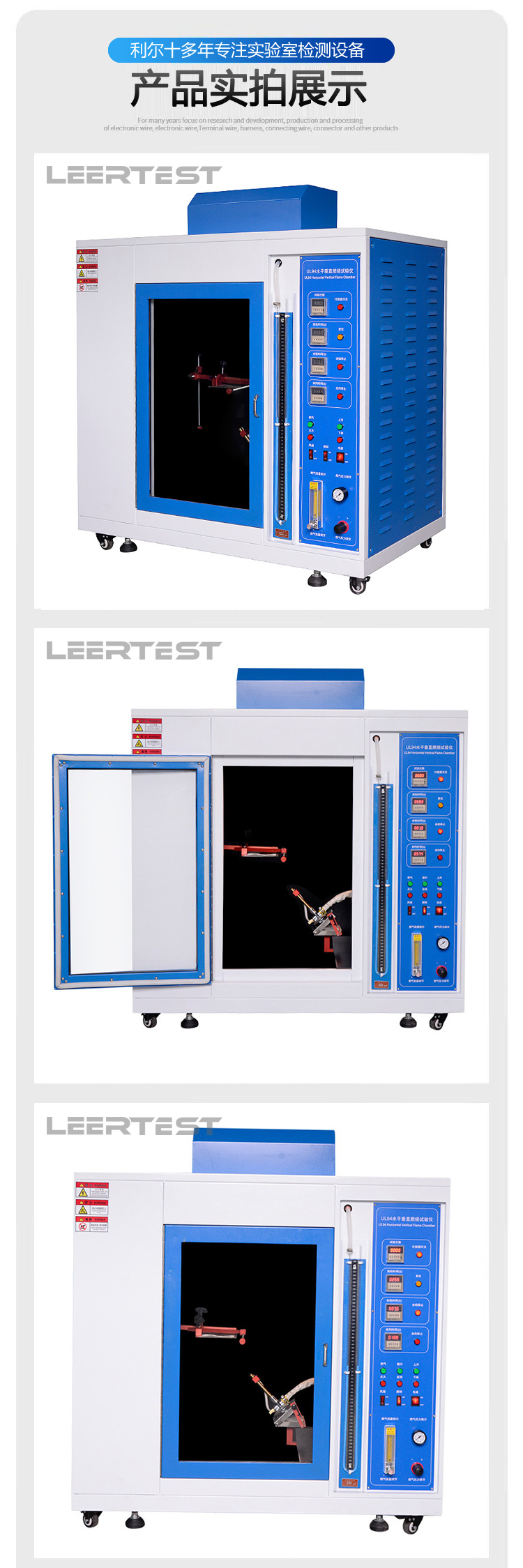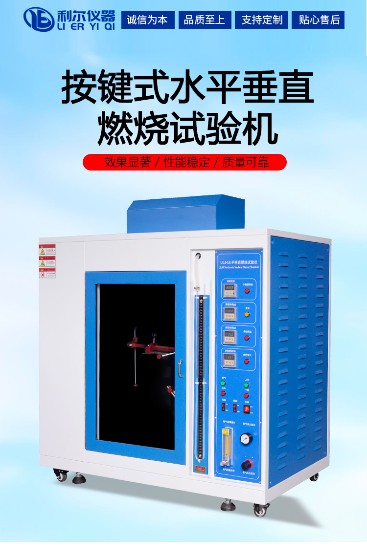 本试验仪适用于检验和评定塑料材料的燃烧特性,是根据美国UL94 标准及GBT2408 标准《设备和器具部件用塑料材料的可燃性试验》中规定的有关条款设计制造,对设备和器具的塑料部件进行水平、垂直可燃性试验,并配置有气体流量计,调节火焰大小,操作简单安全。本仪器可评定材料或泡沫塑料的可燃性如:V-0、V-1、V-2、HB、5V、HF-1、HF-2、HBF级。