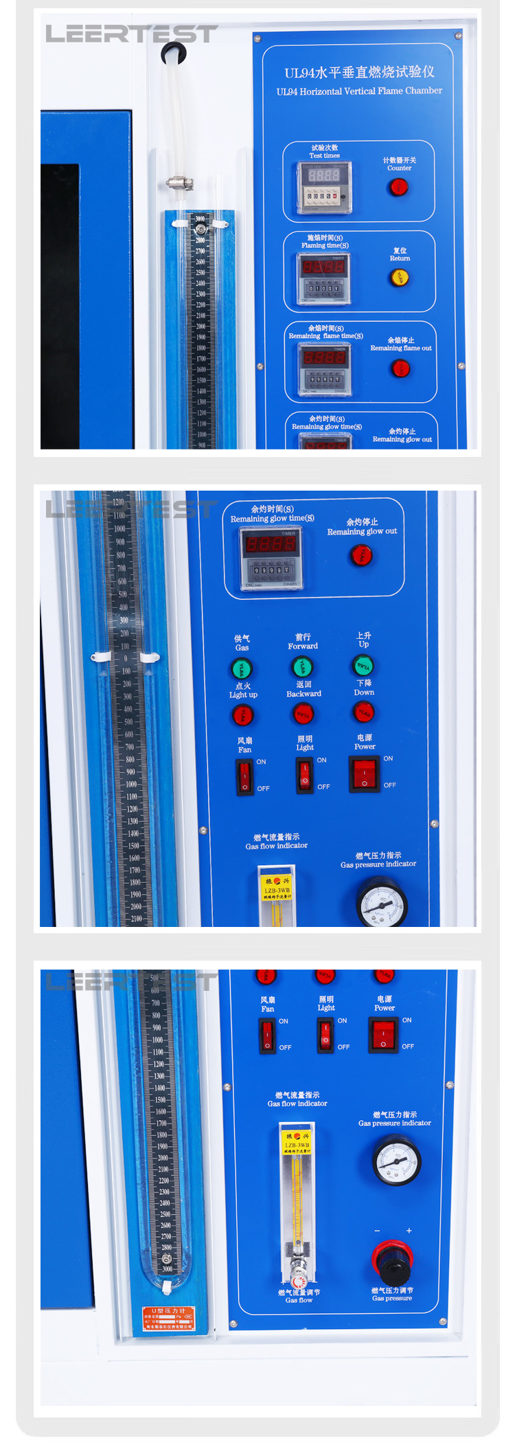 - 产品特点:另配置有照明装置,抽气装置,燃气流量调节阀,燃气压力表,燃气压力调节阀,燃气流量计,燃气 U 型压力计及样品夹具