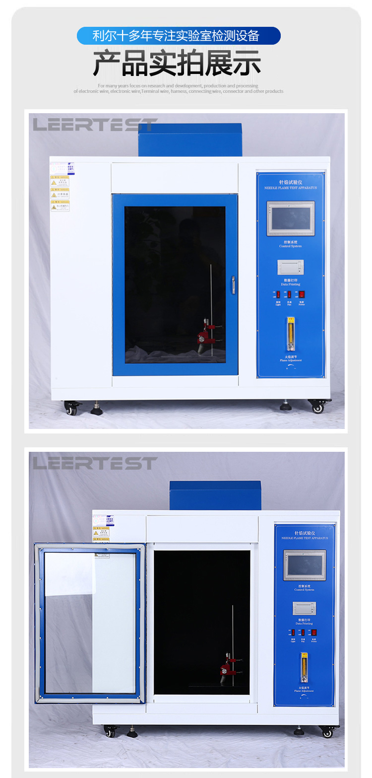 本产品根据用于电子、电器产品中由于故障条件,如流过泄漏路径的故障电流、元件或零件的过热、不良接触等情况均可能引起火焰,它可能又射到附近的零件上,本试验就是模拟产品内部在故障条件下所产生了小火焰,用模拟技术评定着火危险性。对于小零件(或元件)灼热丝试验或水平-垂直燃烧试验方法不适合时,可引用针焰试验方法。如样品在进行灼热丝试验时起燃 ,则所产生的燃烧危险情况还需用针焰试验。适用于对电子电工产品、家用电器的部件、零件等,如:接线板、离心开关、电饭锅插座。