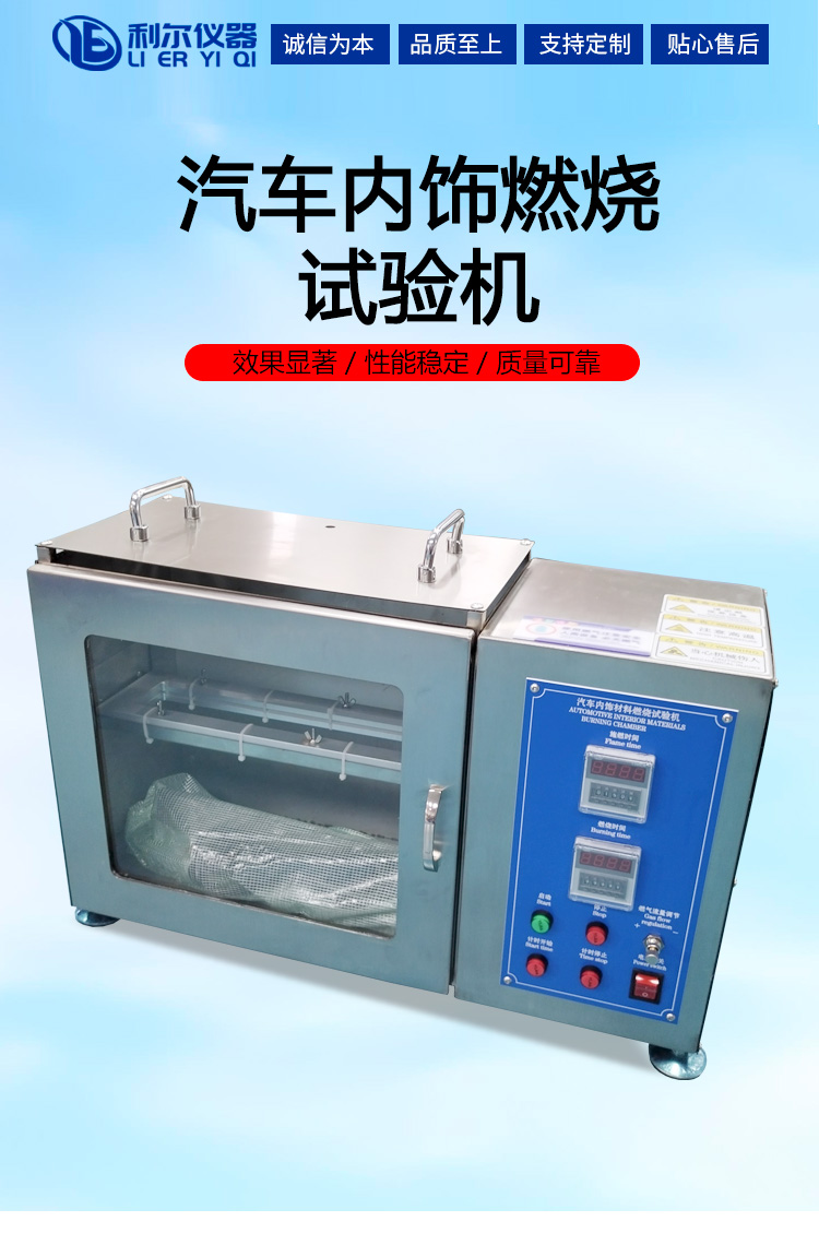 本燃烧试验机适用于汽车内饰材料水平燃烧特性本机燃烧箱为不锈钢制做, 外型美观, 耐烟、气腐蚀, 且控制系统自动化程度高,具有自动点火,自动供气,自动计时,自动结束试验等功能,观察记录方便,使用稳定可靠。