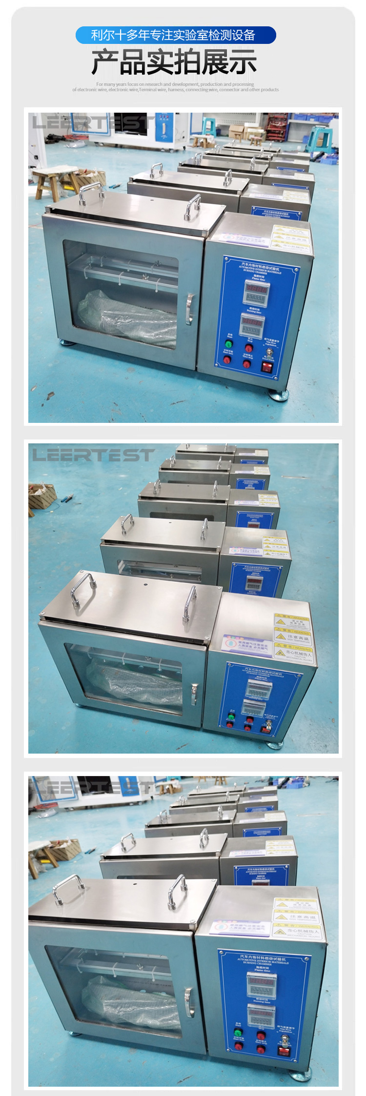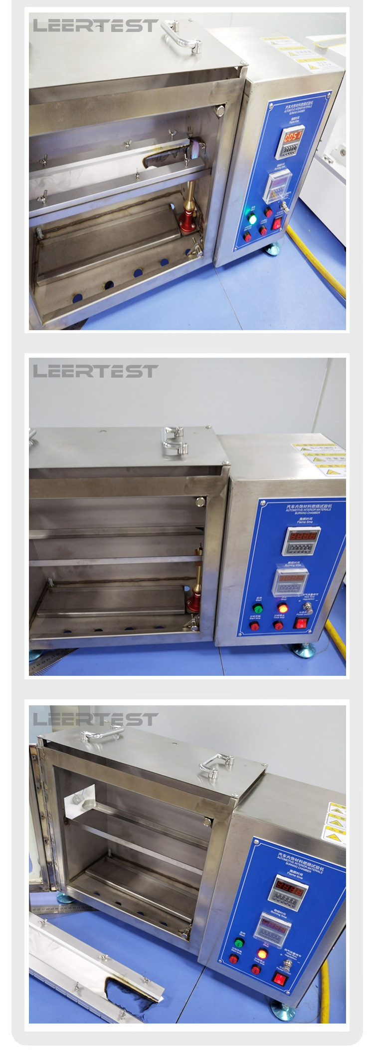 - 产品特点:本试验机由控制箱、燃烧箱本体、燃烧灯、电磁阀、整套配置高压点火器、温度计、信号控制线及试样上、下支架及 500mm/1mm 钢板尺组成。