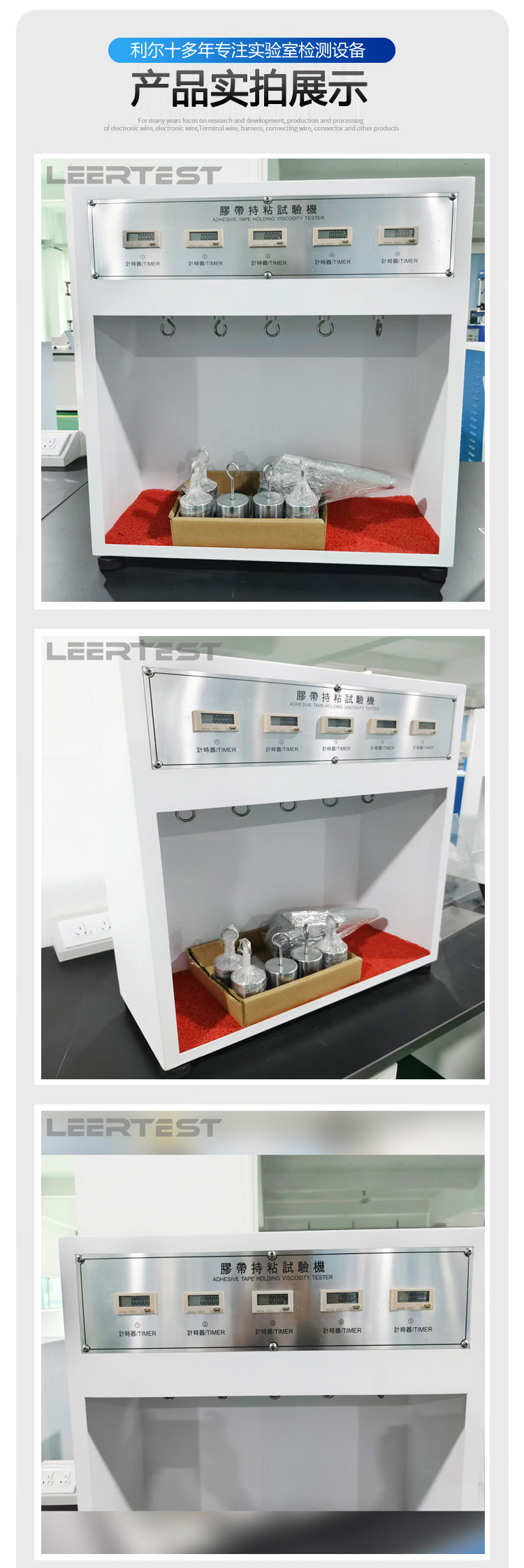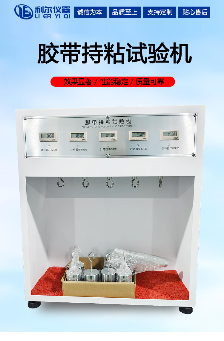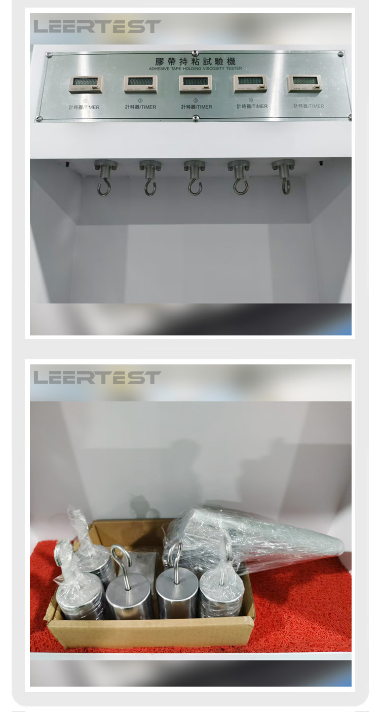 产品概述: 适用于压敏胶粘带胶粘制品进行持粘性测试。把贴有试样的试验板垂直吊挂在试验架上,下端悬挂规定重量的砝码,用一定时间后试样粘脱的位移量或试样完全脱离的时间来测试胶粘带抵抗拉脱的能力。