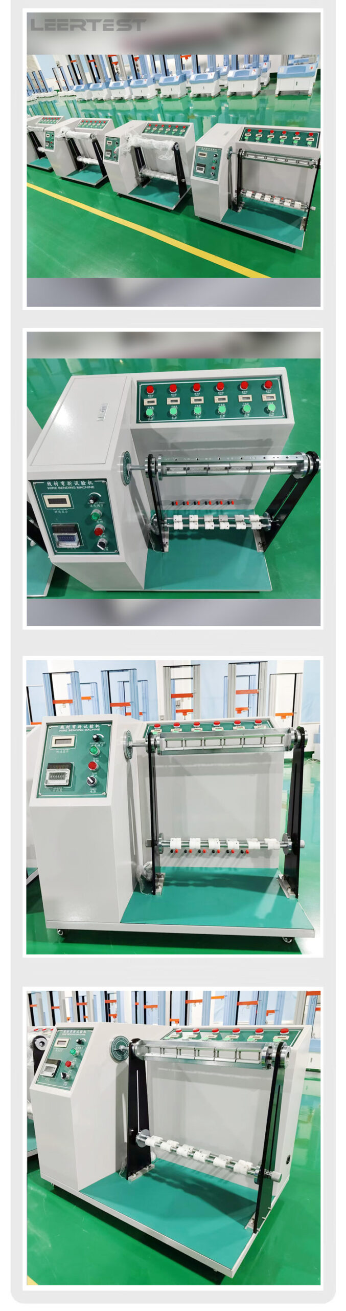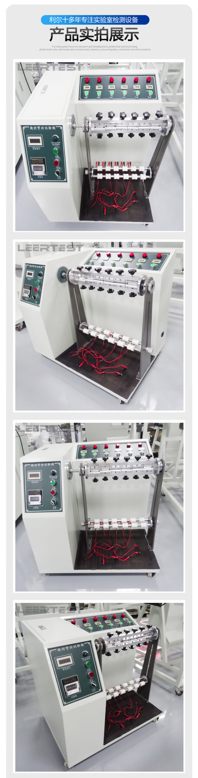 本试验机符合UL817等有关标准“软线组件和电源软线通用安全要求”的规定。适用于有关生产厂家和质检部门对电源线、DC线进行弯曲试验。本机可以测试插头引线及电线耐折强度,是将试品固定于夹具后施重,经弯曲到预定次数后,检测其断线率,或无法通电时机台自动停机,检视其总计弯曲次数。